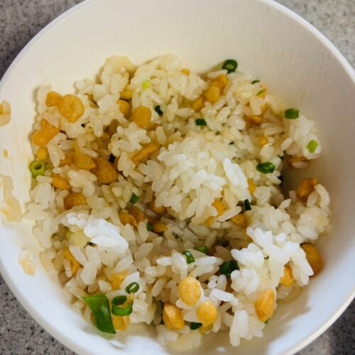 ご飯にあげ玉、小ネギ、麺つゆを入れて混ぜ混ぜ