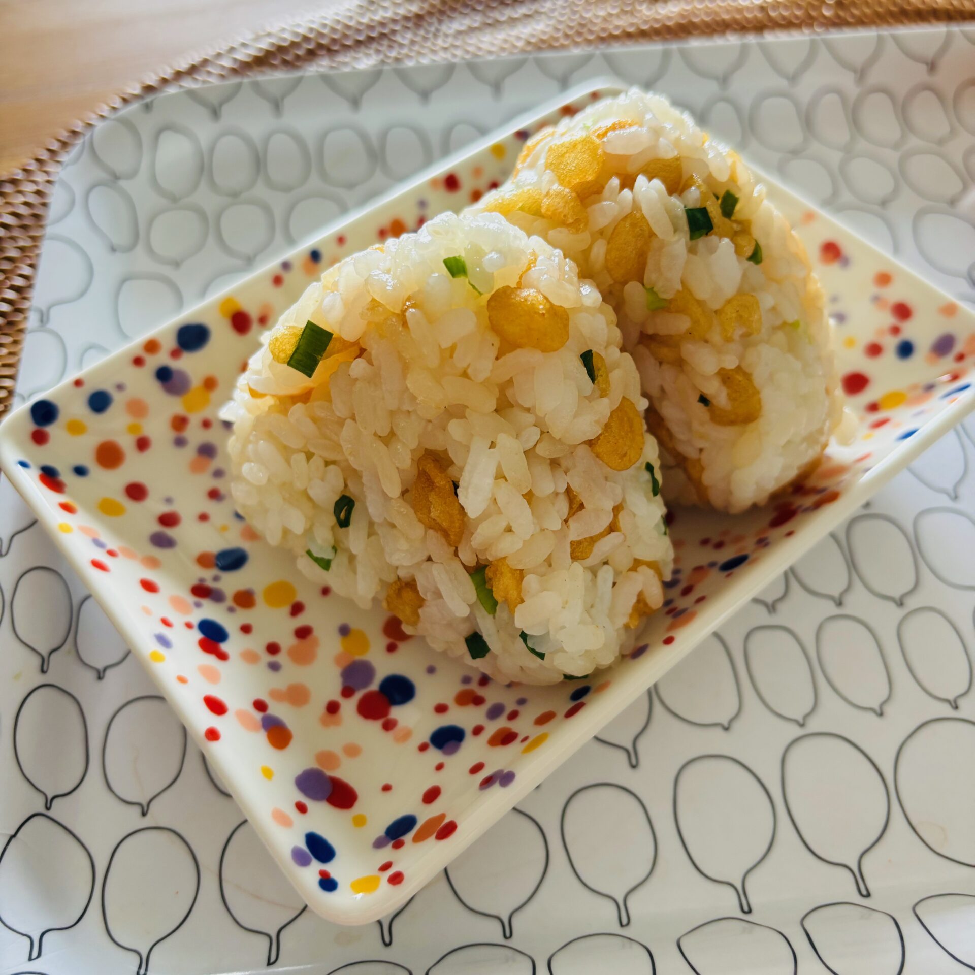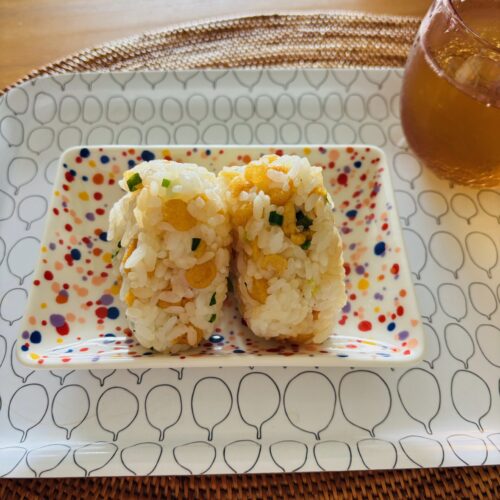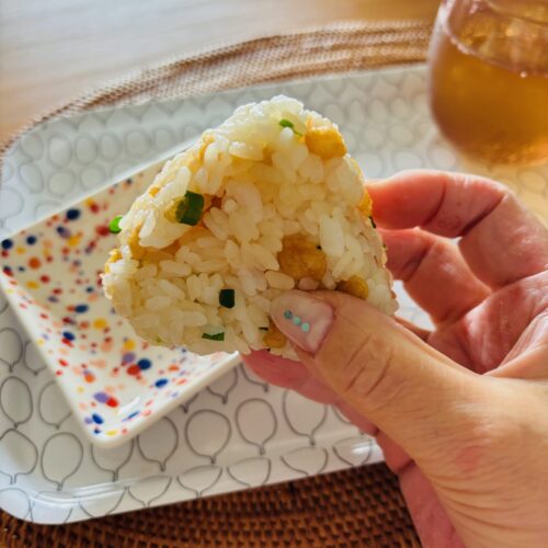 小さいおにぎり2個、あげ玉入りはなんか見た目も可愛いですね。