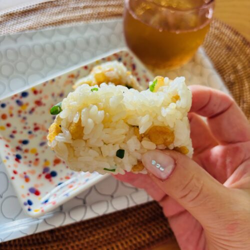 この前の平日ランチ会のお土産に購入しておいたカルディの「あげ玉 柚子こしょう味」でたぬきおにぎりを作りました!