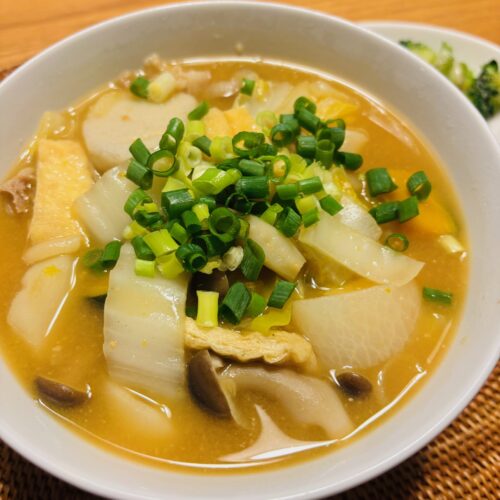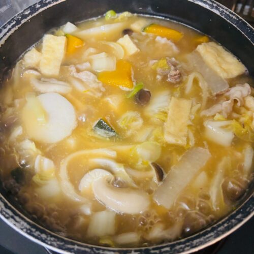 白菜、里芋、カボチャ、しめじ、大根、油揚げ、豚肉と・・