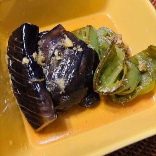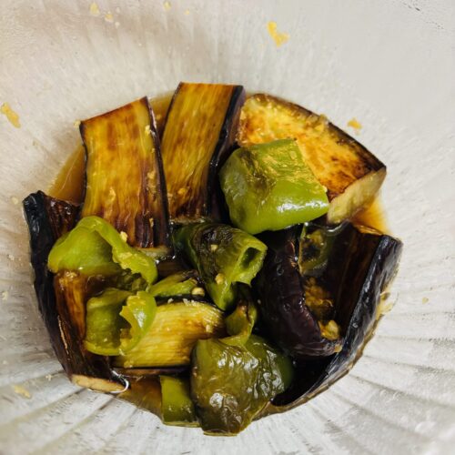 今回はナスとピーマンの焼き浸し、味付けは生姜風味の和風で。