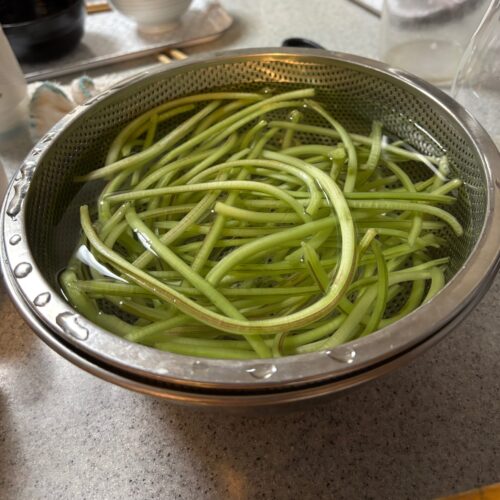 どうにか終わってしばらく水につけて5センチくらいに切ってから油揚げときんぴらにしました。