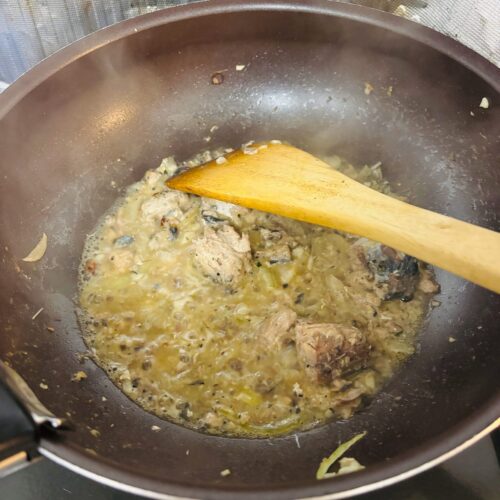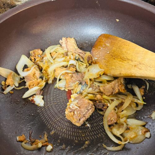 ニンニクと玉ねぎをオリーブオイルで炒めて、サバ缶、パスタの茹で汁を入れて煮詰めます。