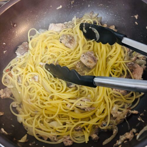 茹で上がったパスタを加えて、塩胡椒、味の素を入れて